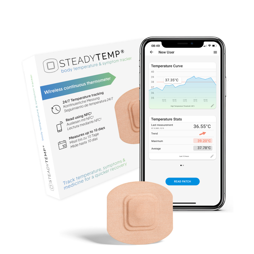 Das STEADYTEMP (R) Smart Wearable Thermometer besteht aus zwei Komponenten: dem intelligenten Sensorpatch und der begleitenden App, mit der die Aufgezeichneten Temperaturdaten ausgelesen und als übersichtliche Kurve dargestellt werden.