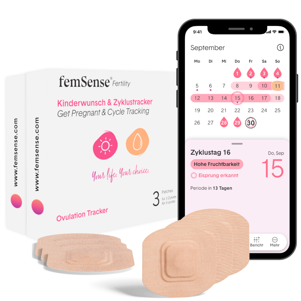 Ein intelligenter Sensorpatch misst während des fruchtbaren Zeitfensters rund um die Uhr die Körpertemperatur und erkennt zuverlässig den Eisprung. Die femSense App informiert die Nutzerin automatisch, sobald der Eisprung festgestellt wurde – einfach, diskret udn wissenschaftlich fundiert.
